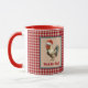 This funny rooster wants to cheer you up for your morning coffee during the holidays or any day, especially if you're feeling peckish. He's wearing a Santa hat and encouraging you to "Peck the Halls" - but you can edit the text if you want as long it's short. The rooster has an antique look, with dusty teal blue feathers, and is set against a tan and white faux dotted Swiss and framed in teal. The mug background is a cheery gingham-like farmhouse chic plaid. Be forwarned that Santa might be chicken his list twice :-).