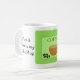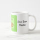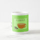A funny coffee saying on this mug. A green coffee sign with an orange coffee mug filled with hot coffee and a few loose coffee beans beside it. Message says' when it comes to my coffee mug, size does matter.