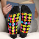Funny colourful faces pattern design. Some are happy, silly, angry, winking, joyful, funny, in love, pouting, tongue out, and more fun emotions in colourful bright colours; yellow, orange, red, blue, red, pink, and purple, on a black background.