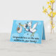 A fun congratulations on your need baby card featuring a cartoon stork wearing headphones delivering a screaming baby boy. The outer part of the card reads "congratulations on the new addition to your family!" and the inner part reads "Good luck! (You're gonna need it!) but you can change the text to say what ever you like as it is fully customisable!