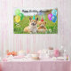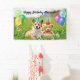 Fun Happy Birthday banner of a Photo art detailed illustrative style of funny corgi dog and cute teddy bear with party hats and floating balloons. Great idea for your party for your young child: son or daughter. You can customize the text to change name and message.