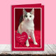 This cute kitten valentines day card features an adorable dilute calico kitten on the front with a red heart that reads, "I may just be a kitten but ...". The funny part is in the inside text. There is a play on cat words that will make the recipient happy. This is a great card for anyone with a good sense of humor who loves cute kittens and who doesn't! Copyright Peaches the Tuxedo Cat
