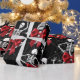 Funny dancing skeletons and red bow wrapping paper with spiderweb details.
