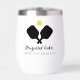 Who's your designated dinker? Funny wine tumbler features crossed Pickleball Paddles, a ball and 2 lines of personalized text. Perfect as a club or tournament award, gift for your pickleball bestie friends, a pickleball trip memento, drink ware for apres pickleball gatherings and just everyday pickleball fun! Easily change the paddle, ball and text colours.