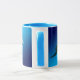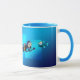 DIVERS´ BLUE MUG. A cartoon scuba diver is followed by a dangerously big shark. The diver is staring at a small fish curiously and the fish opens its eyes big when it sees the shark that follows the diver. A mug designed in different shades of blue, also de handle and inside are blue. You can choose from different styles of mugs and colords, there is also the choice of a morphing mug.