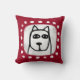 A cute drawn dog in black and white over a red textured background surrounded with white dots.