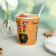 "DRINK UP WITCHES" say these cute Halloween party paper cups. On one side of the text is a pair of striped stocking legs with black and lime green boots. On the other side is another pair of witch legs with purple boots upside down in a black cauldron. The image and text are placed on a pale orange jack o lantern pattern background. *Thanks to Huckleberry Hearts for the clip art used in this design.