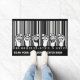 A black doormat with a barcode design featuring cartoon feet with different expressions. The barcode is labelled Scan Your Feet Before Enter Door.