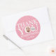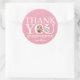Fun birthday party thank you Sticker featuring pink comic word balloon and simple pink flowers.