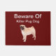 Funny family pet home welcome mats with a Pug dog graphic and humourous saying warning of dangerous dog in a humourous way to greet house guests to your home.