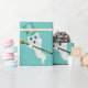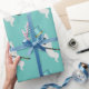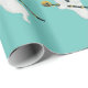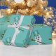 This wrapping paper is a bright blue green colour with funny fancy dressed up white ghosts wearing blue top hats with gold ribbons and holding gold trimmed black canes with golden skulls on top.