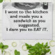 The next time any chauvinist / sexist man says the same, predictable "go to the kitchen and make me a sammich" line, point to the witty comeback on this kitchen towel. It shows a vintage woman with a proud smile on her face and a giant sandwich in front of her, alongside a bottle of poison. The text reads, "I made you a sandwich as you suggested. I dare you to eat it." Because whoever controls your food supply, controls your fate.