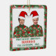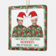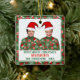 Custom and personalize this ugly Christmas sweater Christmas tree ornament featuring two people, both wearing the same Ugly Christmas sweater and Santas hat. Green sweater with very festive holiday pattern featuring red Christmas ornaments, santa claus hat, sugar plums, snowflakes, and Christmas stockings.