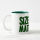 Drink your hot beverage in this humourous fishing coffee mug before heading out to get the big one! Large, bold letters say SIZE MATTERS, with a huge jumping fish. Black, grey and green colours, shown on a two-tone mug.