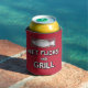 Keep your beer cold while you fish with this humourous foam can cooler. This parody design is for anyone who fishes, particularly those who enjoy cast net fishing. Instead of Net____ and Chill, it says, "Net Flicks and Grill" with an image of a fish in a net. The background is red, and the design appears on both sides.
