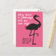 Funny flamingo riddle "Why does a flamingo lift up one leg?" is fun for anyone but especially fun to send to grandkids or children. Black flamingo silhouette illustration on a bright pink background with a fun font.