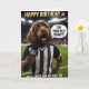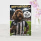 Funny football-themed birthday card featuring a dog in a post match interview with a VAR joke.