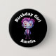A personalized birthday girl button with a cute illustration. Frankenstein monster with pink and purple hair and a dapper coat and tie.