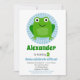 L'invitation d'anniversaire de ce garçon comporte une drôle de grenouille verte avec de grands yeux sur un arrière - plan en spirale bleue.