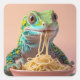 Add some humour to any surface with this Funny Gecko Eating Spaghetti Square Sticker! Featuring a whimsical gecko indulging in a plate of spaghetti, this sticker is sure to bring smiles wherever it's placed. It's perfect for decorating laptops, water bottles, notebooks, and more. Let this delightful sticker showcase your playful personality and spread joy with its charming design!