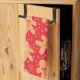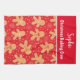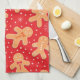This is custom kitchen towel for Christmas baking crew featuring funny personalized Gingerbread man cookies pattern in different funny expressions with little snowflakes on bright red background .