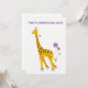 Children's party invitation with a cute giraffe nibbling on a violet flower and holding some flowers with its tail.