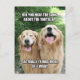 This funny meme postcard features a photograph of two golden retriever dogs who are laughing at a joke. The joke reads, "Did you hear the song about the tortilla? Actually, it was more of a wrap." Text on back reads, "A joke to make you smile," but this can be changed or deleted.