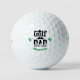 Custom personalized golf balls with the saying 'Golf Dad ' in black typography. The 'o' in the word golf has a black hat above it and there's a black moustache in the phrase between the words golf and dad. In green typography are your first and last initials along with a name on the bottom all of which can be edited . Add your first initial on the left, your last initial on the right and your own name on the bottom.