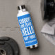 Celebrate the retirement of a soon-to-be former coworker with this funny water bottle, which features the sentiment, "Goodbye Nine to Five Hello Happy Hour" in a white, grunge style font, with an apple martini cleverly standing in for the "Y" in "Happy" on a soothing baby blue background. Reverse shows identical design.