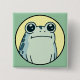 Cute square button/pin of funny green cartoon frog with big eyes and a deadpan look on his face on a yellow and green background.