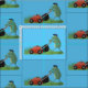 Funny green frog mowing lawn cartoon fabric
