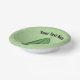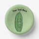 This paper bowl has a big funny green pickle with stem and a surprised face with open mouth and wide green eyes on a light green background. Customise your text with the template.