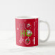 Funny HO HO HO Retro Christmas Holiday Coffee Mug, features a retro handwritten typography "HO HO HO" with Christmas cartoon characters: Santa claus, snow men & teddy bear, isolated on red background with white snowflakes.
