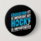 Funny hockey themed button with blue and white text on a black background reads Education is Important But Hockey is Importanter!
