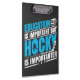 Funny hockey themed clipboard with blue and white text on a black background reads Education is Important But Hockey is Importanter!