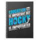 Funny hockey themed notebook with blue and white text on a black background reads Education is Important But Hockey is Importanter!