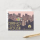 Creative cartoon style invitation design for a housewarming party to celebrate someones new home, Drinks are on the house quote incorporated in the Design. Cocktails are shown on top of the house. Please personalize text.