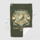 Elegant vintage design features a light green crest with crossed golf clubs with a golf ball in the centre. Two gold banners contain the phrase "Born to Golf, Forced to Work." Two lines of text let you customize this gift for any occasion to make it a very special gift. A dark green background frames it perfectly.