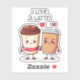 “I love a latte!” is playfully written in a charming font. The design features two adorable takeout lattes holding hands, with little hearts floating above them, symbolizing the warmth and love they share.