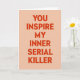 This greeting card features a light peach background with a funny, edgy message in the middle. The text reads “YOU INSPIRE MY INNER SERIAL KILLER,” and it’s written in bright red, all-capital letters. The letters are thick and simple, and the words are stacked in a neat column from top to bottom. There are no characters or extra objects, so your eyes go straight to the message. The soft background color makes the red text stand out, giving it a sweet look even though the line is dark humor. It feels like a cheeky card you’d give to someone who gets your kind of joke and can laugh with you