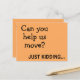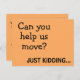 This is a simple minimalist text design with two fonts and a sassy sarcastic and funny one liner joke on the front that says: Can you help us move? just kidding...on a vibrant orange background. The back says: But we made it! Please make a note of our new address, and there is a text template for you to add your new address or you can delete that part and write it in by hand. #newaddress