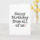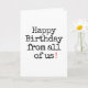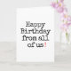 Dehors : "Joyeux anniversaire de nous tous !" À l'intérieur : "(mais surtout de moi puisque personne d'autre ne pouvait se donner la peine de faire autre chose que signer cette carte)"