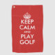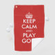 Funny keep and calm and play golf towel gift. Personalized presents for him or her. Unique golfing gifts for men and women. Humourous Birthday gift ideas for legendary golfer, husband, dad, father, friend, co worker, boss, colleague, coach, instructor, trainer, teacher, grandpa, retired person, golf lover etc. Including hook to hang it up. Unique golf accessories for friends and family. Customizable keepcalm typography template with vintage crown. Red or custom background colour. Other examples: keep calm and carry on, Keep calm and party on etc.