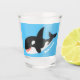 This cute design features a happy smiling killer whale blowing bubbles on a blue background for fun!