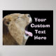 A fun, attention-getting poster print with an original photo of a lion with his mouth wide open, and his tongue sticking way out ready for your own funny custom text in pink to match his tongue in loud bold text blasting right next to his open mouth showing his big teeth. How about "Look Ma, No Cavities" or "Open Wide" or "Say Ahhh" or "Roar" or "I'm King Of The Jungle!" A perfect, cute, funny poster for dentist offices and other doctor's offices, like a pediatrician. Kids of all ages will get a kick out of this poster! Contrasting black background colour can easily be changed to any colour. Just click on "Customize it" and then click on "edit" and then "background" to change it. Text and font style can also be easily changed.