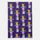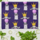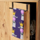 Kitchen towel with a charming yet funny pattern. Designed with a whimsical llama blowing a big pink bubble while chewing gum. Wearing a gold crown and a black bow tie. Dark purple background.