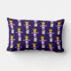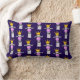 A lumbar pillow with a charming yet funny pattern. Designed with a whimsical llama blowing a big pink bubble while chewing gum. Wearing a gold crown and a black bow tie. Dark purple background.