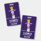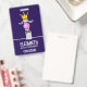 Name badge with a whimsical llama blowing a big pink bubble. Wearing a gold crown and a black bow tie. Dark purple background.