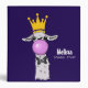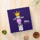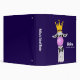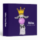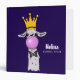 Personalized binder with a whimsical llama blowing a pink bubble while chewing gum. Wearing a gold crown and a black bow tie. Dark purple background.