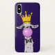 Casemate case with a whimsical llama blowing a big pink bubble. Wearing a gold crown and a black bow tie. Dark purple background.